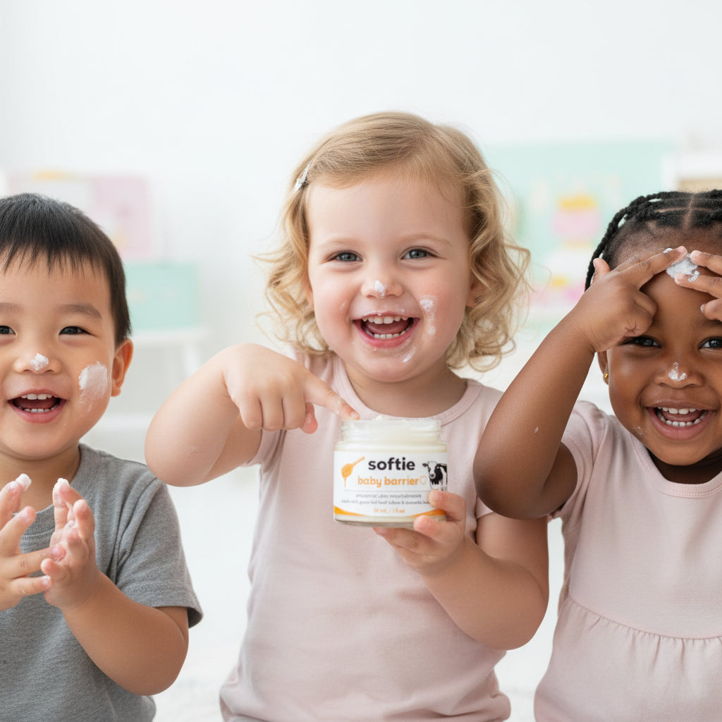 Most parents find us after building an "eczema graveyard" of 10+ failed products. Conventional lotions are often water-based and contain alcohol that can sting or steroids that suppress symptoms temporarily. Softie focuses onnourishment over suppression, using animal-based lipids to physically rebuild the skin’s shield so flare-ups stop coming back.